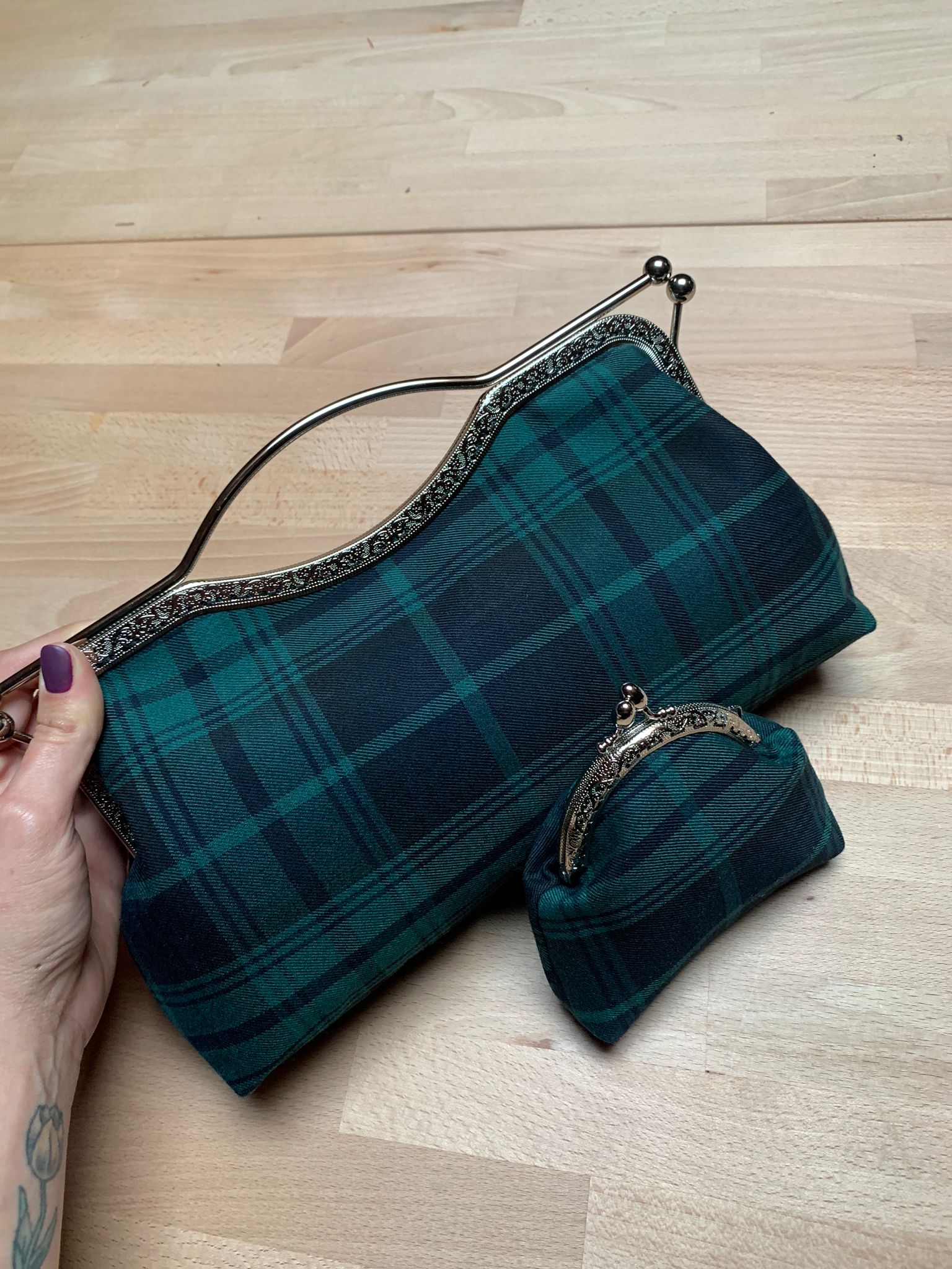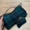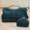 Realizzata con tessuto in tartan ottanio, blu scuro e nero; interno in cotone color nero o blu scuro.