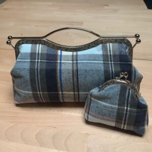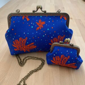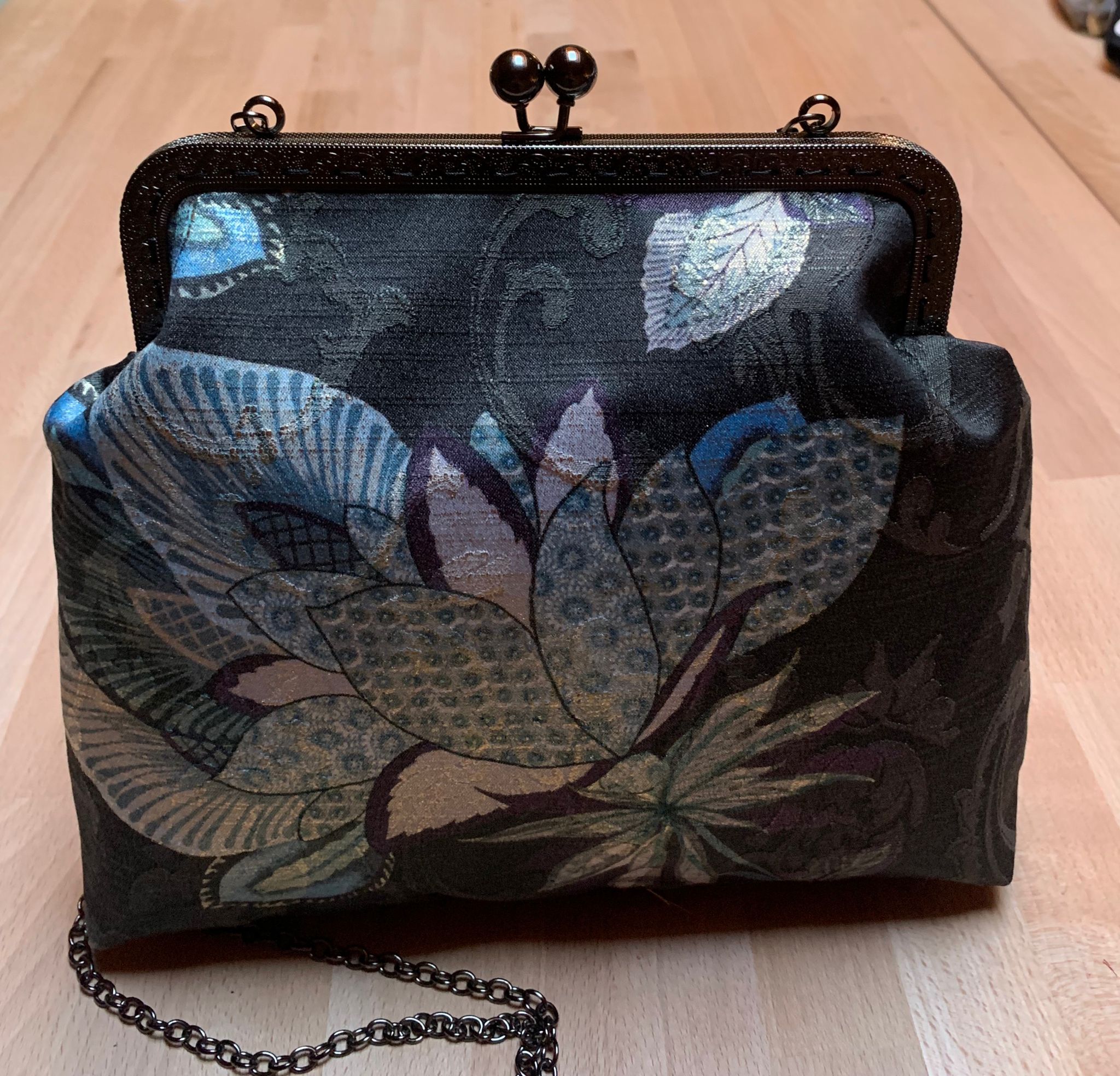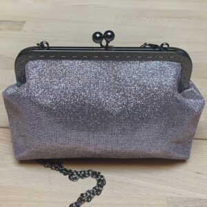 Maxi pochette fatta a mano, con chiusura clic clac color argento scuro, completa di catenella di 120cm.