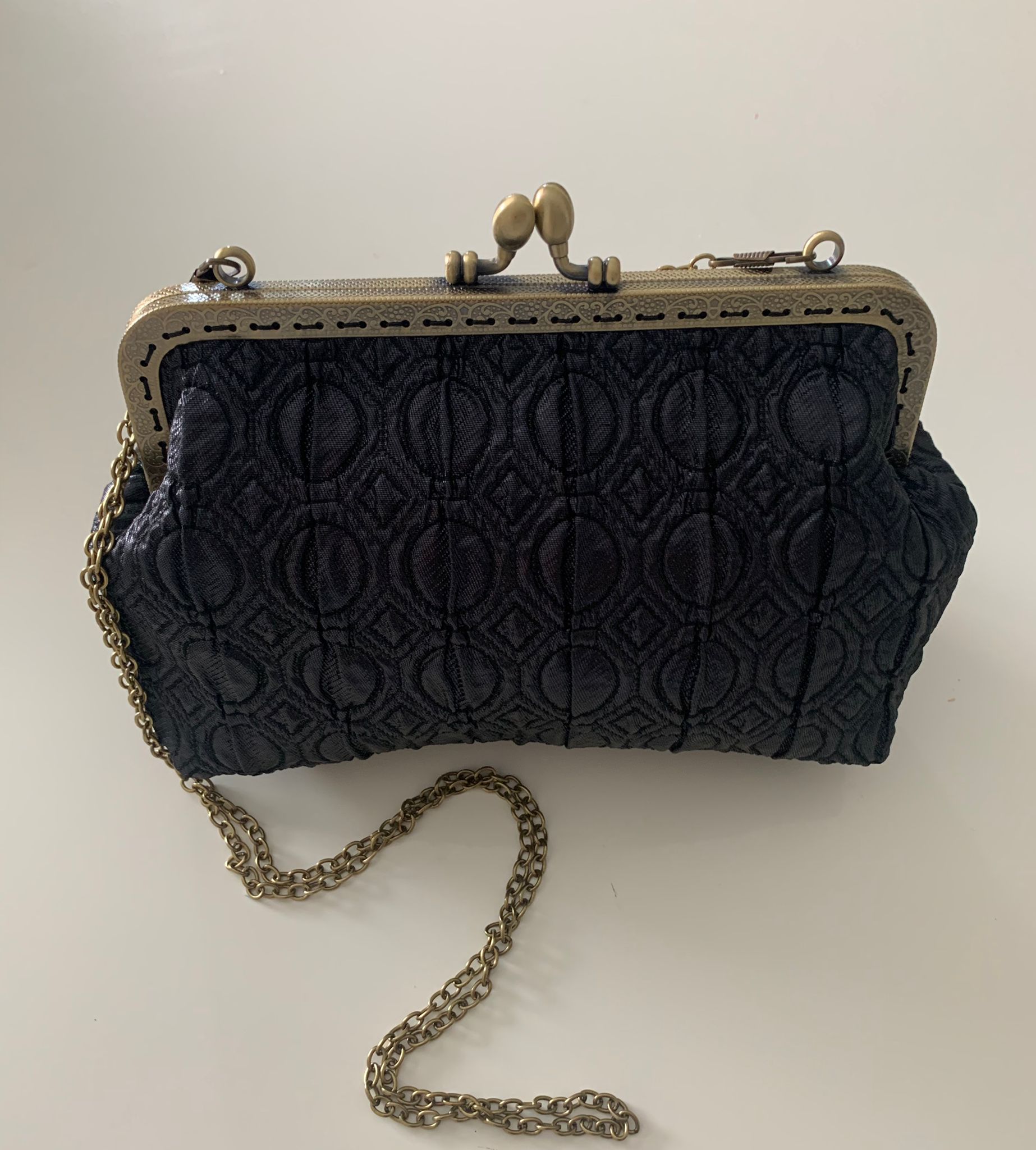 Pochette fatta a mano, con chiusura clic clac color bronzo antico, completa di catenella di 120cm.